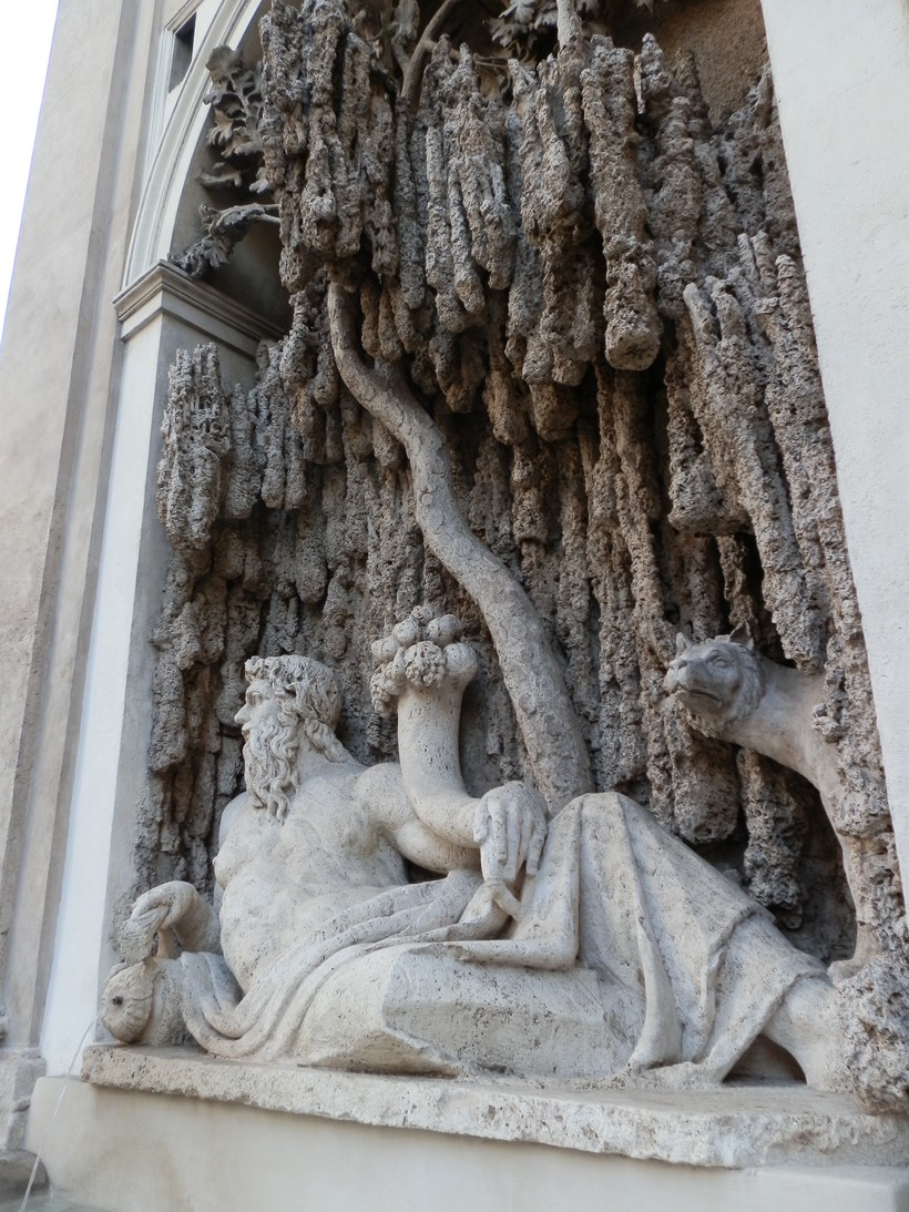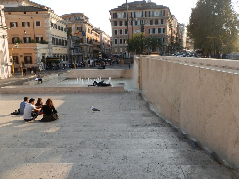 Рядом с музеем расположен необычный фонтанчик (12), вода в который поступает тонкой струйкой, текущей прямо по стене. На ступенях перед фонтаном – привычная для Рима картина: отдыхают утомлённые туристы под пристальными взглядами непуганых чаек. Эти птицы здесь действительно ничего не боятся, мне кажется, при желании их можно легко брать на руки, правда, никто благоразумно этого не делает.