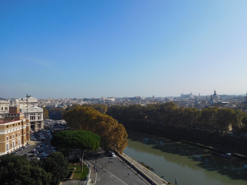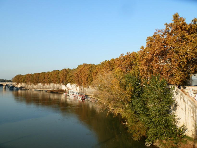 Выйдем к мосту Ponte Cavour (13) и полюбуемся видами Тибра. Видно, что река сильно обмелела за прошедшие века, но глаз всё равно радуется открывающимся видам.