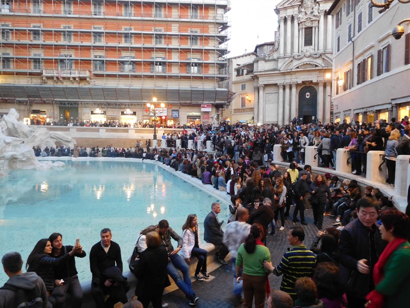 В плане популярности у туристов это место наверно не имеет себе равных в Риме: площадь перед фонтаном всегда, более или менее, забита народом. Из-за этого обстановка здесь суетливая – непрерывная толчея и толкотня. Каждый хочет кинуть в фонтан монетку (есть даже градация: 1 монета – вернуться в Рим, 2 монеты – встретить любовь, 3 монеты – к свадьбе и т.п.). Говорят, за год власти города извлекают из Фонтана Треви монет, в общей сложности, на 1,5 млн. EUR.