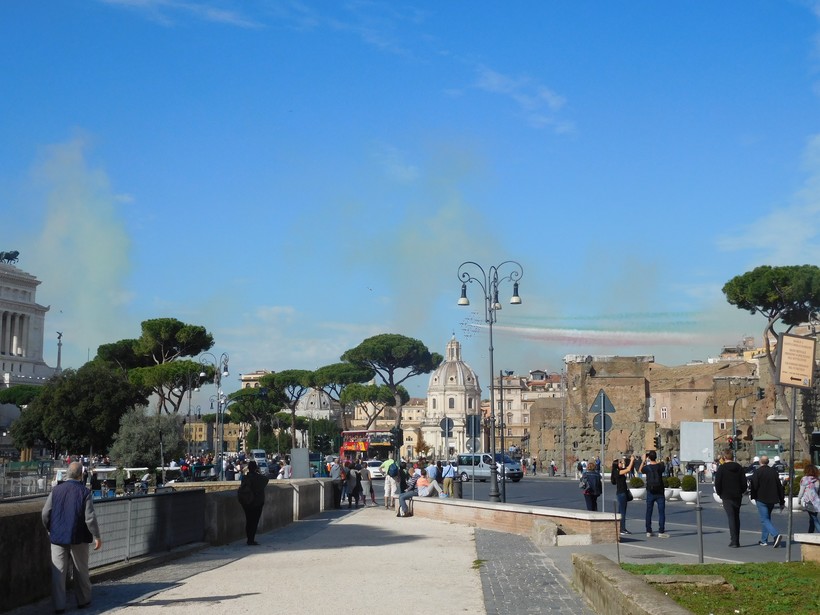 Впрочем, особо здесь не задерживаемся: минуя via Dei Fori Imperiali (2), идём к развалинам Форума Августа (3). К слову, здесь, в центре Рима частенько устраивают своеобразное авиашоу: периодически в воздухе проносятся самолёты, оставляя за собой в небе цвета итальянского флага.