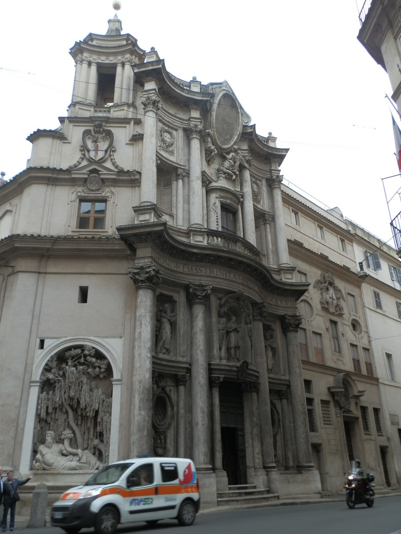 Церковь создал Борромини, а фонтан – Бернини. Оба были выдающимися мастерами и очень не любили друг друга (так у гениев Возрождения часто было заведено). Отсюда и родилась легенда: одна из фигур фонтана как бы закрывается в ужасе рукой от церкви, опасаясь, что она скоро рухнет. Такой, якобы, был «привет» от Бернини к Борромини. Эта легенда, конечно, вымысел чистой воды, но ведь и вправду забавно.