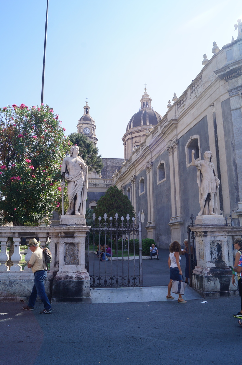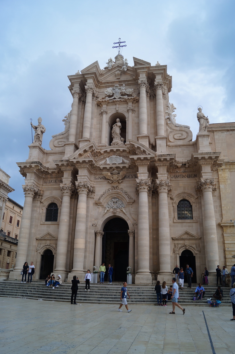 Одна из главных достопримечательностей Сиракуз – это кафедральный собор с внушительным фасадом в стиле барокко 18 века. Любопытно, что здание было построено первоначально на греческом храме Афины, и даже можно лицезреть многовековые дорические колонны, которые сейчас сливаются со стенами собора. Особенно мне понравилась и была интересна фигура покровительницы слепых – Лючии Сиракузской на портале собора.