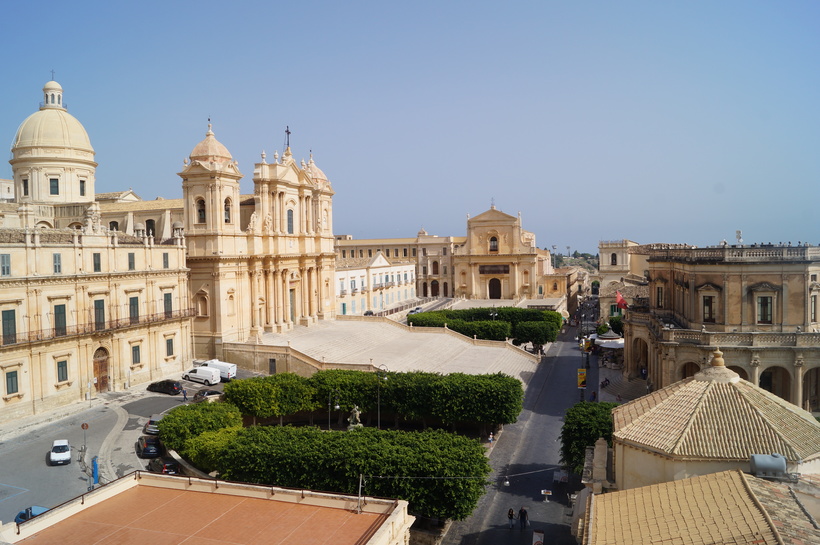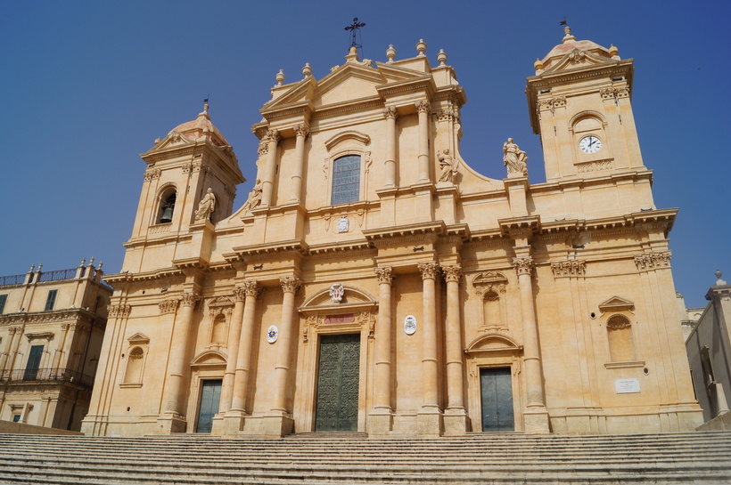 Настоящая жемчужина сицилийского барокко – это великолепный собор города Ното. В 1996 году его купол рухнул из-за структурных повреждений после землетрясения 1990 года. Восстановленный собор сегодня – одна из главных достопримечательностей города и культурного наследия ЮНЕСКО. К собору, чудесному как снаружи, так и внутри, ведет широкая красивая лестница. Надо сказать, что белый камень, свойственный сицилийскому барокко, показался мне таким теплым, впору солнечной Сицилии.