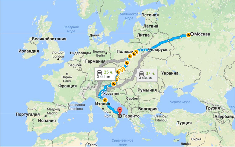 Путь на автомобиле от Москвы до Таранто займет около 3-4 дней (общее расстояние 3444 км), учитывая, что непосредственно за рулем вы будете находиться по 12 часов в день. В одиночку ехать скучно и долго, поэтому в вашей машине должно быть хотя бы два водителя. Для поездки вам будет нужна шенгенская виза, страховка автомобилиста и права международного образца. Говорят, итальянская полиция может оштрафовать как минимум на 300 EUR за отсутствие МВУ. Классический автомаршрут выглядит так: Москва – Белоруссия – Польша – Чехия – Австрия – Италия.