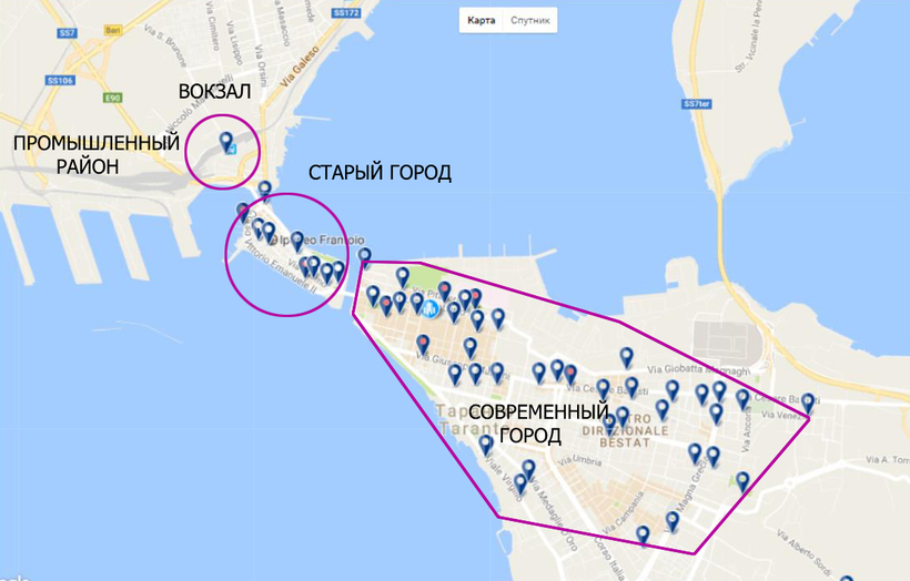 Старый город (островок между двумя проливами, связанный с другими частями Таранто интересными мостами, один из которых разводной),