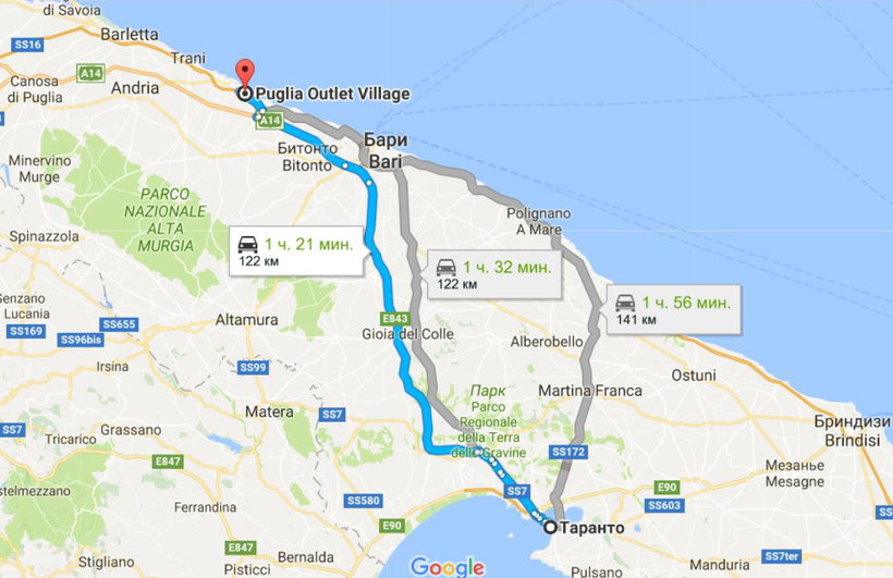Далее вы двигаетесь по трассе A23, в районе Palmanova сворачиваете на Е70 и едете вдоль побережья до Падуи, минуя Венецию. Затем по шоссе А13 до Болоньи, затем по E45 до Форли, и далее А14 – Римини, Анкона, Пескана, Фоджа, Бари. Последний участок дороги Бари – Таранто, шоссе Е843.