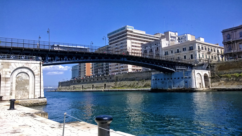 Набережная Таранто. Отсюда открывается прекрасный вид на разводной мост Понте Джиреволе. Набережная проходит по краю Нового города, вдоль аристократичных зданий 19 века, но отсюда хорошо видно и очертания Старого города и морские пейзажи Таранто.