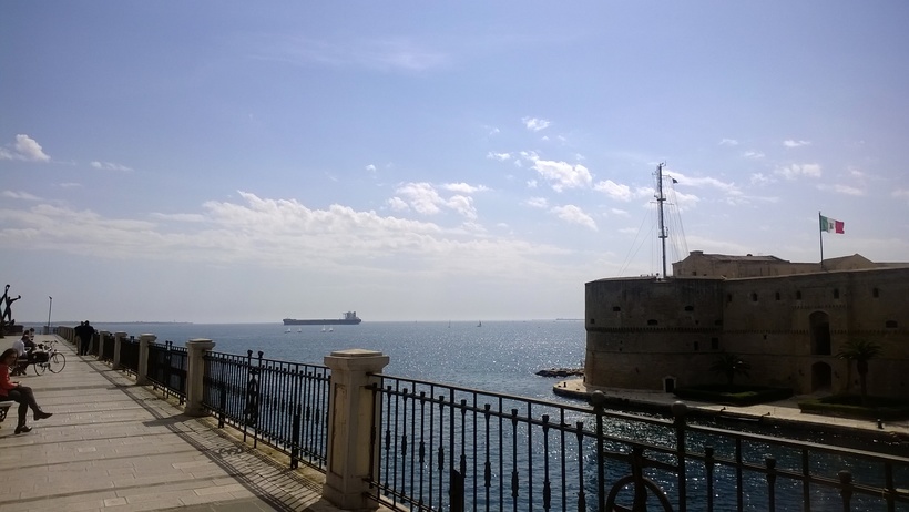 Самая туристическая и самая прогулочная улица Таранто – набережная. Отсюда открывается завораживающий вид на морские просторы, разводной мост Понте Джиреволе, Арагонский замок. Набережная как бы объединяет средневековый Старый город с аристократическим Новым городом. Здания вдоль набережной очень красивые, особенно в закатный час: главное отделение Почты Таранто, Банковский офис, Дворец администрации. Еще здесь высажены пальмы и есть овальная видовая терраса со скамеечками для отдыха. На первых этажах зданий – кафешки с мороженым, мини-пиццерии и проч. Место достойное для прогулок. К тому же, отсюда хорошо видно отличие таранского разводного моста от петербуржского. Наш мост раскрывается исключительно вверх, а тарантский движется в горизонтальной плоскости (вперед и назад), в зависимости оттого, с какой стороны плывет корабль.