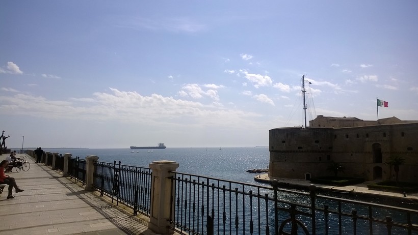 Если вы путешествуете из Греции, например, с острова Корфу, вы можете доплыть на пароме из Керкиры до Бари (билет на общей палубе стоит от 70 EUR, есть вариант с каютами), а потом на поезде добраться до Таранто.