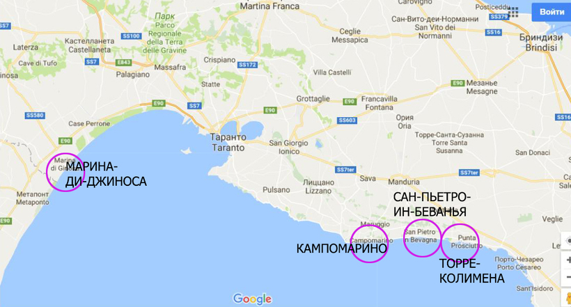 Если проехать в сторону Базиликаты, там можно позагорать на белом песке, например, в Марина-ди-Джиноса. На юго-запад от Таранто есть хорошие местечки – Сан-Пьетро-ин-Беванья и Торре-Колимена (часть на территории заповедника).
