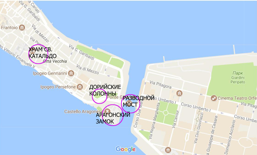 Еще интересное место для прогулок – небольшая площадка перед Арагонским замком в Старом городе (Пьяцца Кастелло), где находятся две дорийские колонны, оставшиеся от древнегреческого храма Посейдона, построенного еще колонистами. Считается, что это самая древняя из греческих построек на территории современной Италии. Изначально колонн было около 25. Территория, на которой они находятся, огорожена металлическим заборчиком, но все видно очень хорошо, есть поясняющие таблички.
