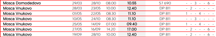 Ниже представлено действующее расписание для Москвы, где указаны: период действия, время отправления и прибытия (по местному времени), номер рейса, дни недели, в которые осуществляется рейс.