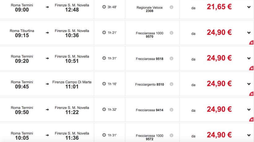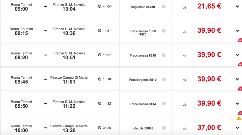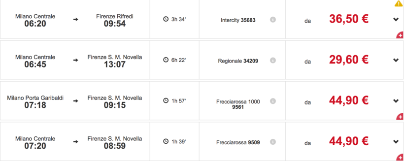 Ниже представлена таблица с различными видами поездов, которые следуют по направлению Милан-Флоренция: Intercity, Regionale (электричка), Frecciarossa, а также указано время в пути и стоимость билета.