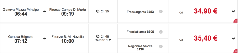 Ниже представлена таблица с различными видами поездов, которые следуют по направлению Генуя — Флоренция: Regionale Veloce (электричка), Frecciabianca, Frecciargento, а также указано время в пути и стоимость билета.