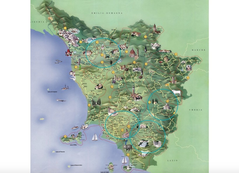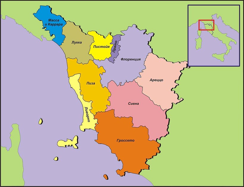 Флоренция, Сиена, Ареццо, Гроссето, Казентино, Кортона, Вольтерра, Монтальчино, Ливорно, Лукка, Пиза, Пистоя, Сан-Джиминьяно, Пьенца, Монтепульчано... Список можно продолжать.