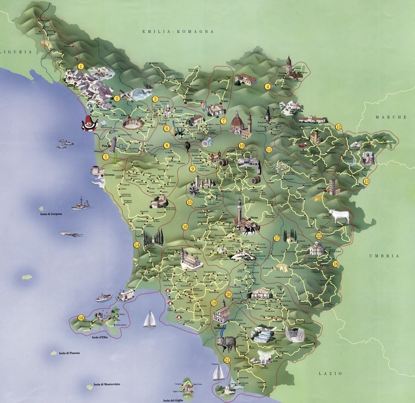 Именно в этих городах расположены основные достопримечательности эпохи Средневековья и Итальянского Возрождения (некоторые из них отмечены на карте).