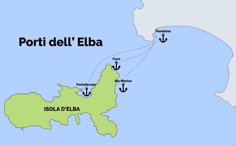 Обычно паромы отходят от города Пьомбино Мариттима (Piombino Marittima) и прибывают на остров Эльба (Elba).