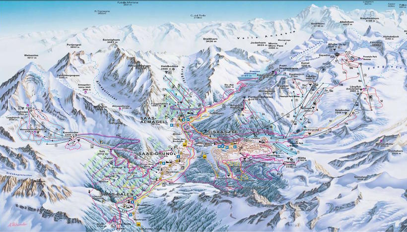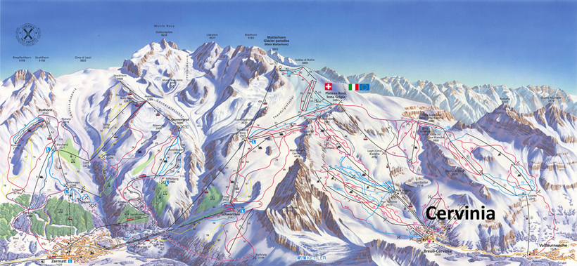 Преимущество курорта заключается в том, что все маршруты хорошо продуманы, и они достаточно разнообразны. Даже если вы приехали на длительный срок, у вас будет возможность осмотреть все вокруг, и не повторять маршруты. Новичкам советую обратить внимание на трассы, отмеченные на карте синим цветом, типа План-Мезон (Plan Maison) — они есть практически на всех склонах. Для опытных же лыжников есть красные трассы, такие как Бонтадини (Bontadidni), они сложны и травмоопасны для неподготовленных спортсменов. Будьте осторожны!