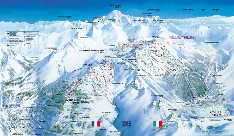 С единым скипассом Валле-д’Аосты вы можете пользоваться любыми подъемниками региона, включая те, которые находятся за его пределами (курорт Аланья-Вальсезия (Alagna Valsesia) в Пьемонте и Ла-Розьер (La Rosière) во французской Савойе).