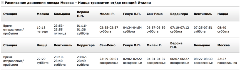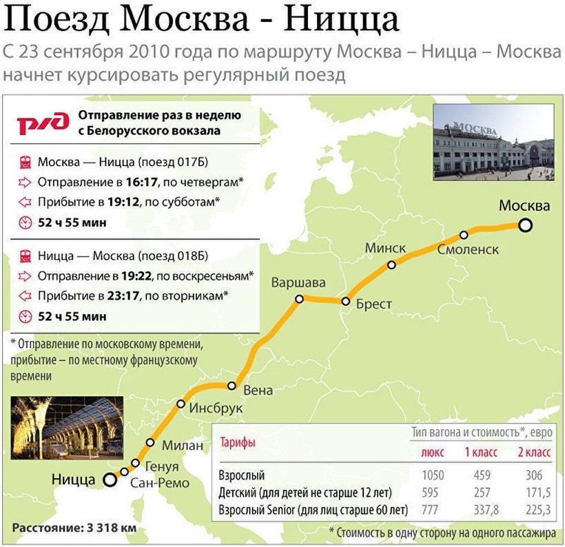 ПоездМосква — Ницца (№17/18 Б — в зависимости от направления) отправляется с Белорусского Вокзала (в 16:17 по российскому времени) каждый четверг. Данный поезд обычно прибывает в Верону на станцию Порта Нуова в районе часа ночи (в 1:16 по итальянскому времени) каждую субботу.