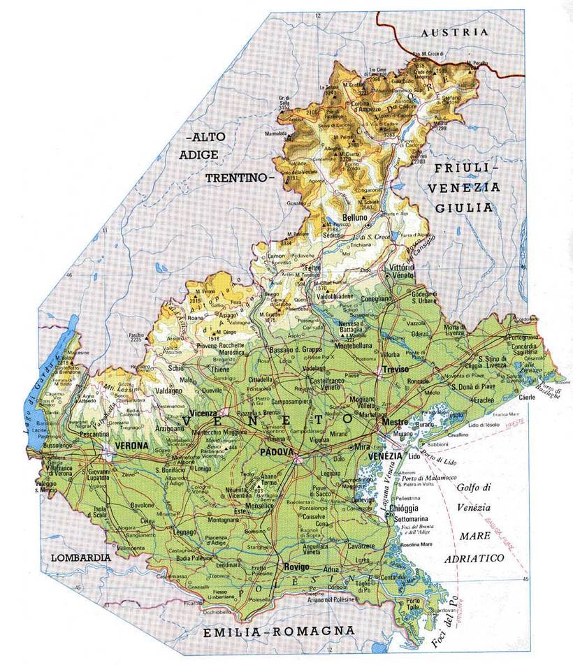 Крупные города, к которым относятся: Беллуно, Венеция, Верона, Виченца, Падуя, Ровиго и Тревизо. Они являются основными центрами туризма, а также являются главными городами 7 одноименных провинций в регионе Венето.