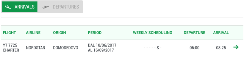 Это чартерный рейс (авиакомпания NORDSTAR), который отправляется из московского аэропорта Домодедово в 6:00 утра (по местному времени) каждую субботу.