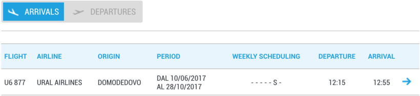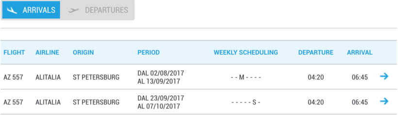 На сайте аэропорта подробно указано действующее расписание в виде таблице на двух языках: итальянском и английском. В расписании указывается: номер рейса, авиакомпания, пункт отправления, период действия расписания, частота рейсов, время оправления и прибытия (по местному времени).