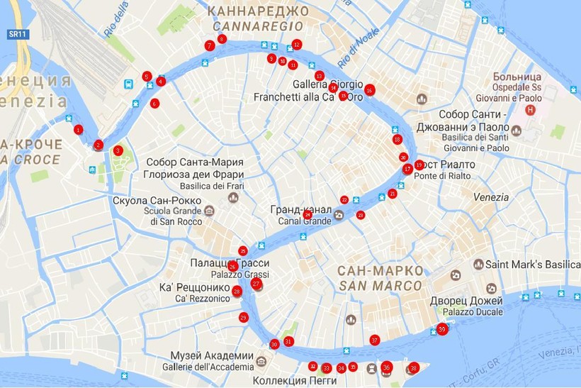 Катера по этим маршрутам идут по Гранд-Каналу со всеми остановками, а значит, мы успеем рассмотреть в пути всё интересное. Собственно говоря, все лодки движутся по Каналу не слишком быстро: существует ограничение по максимальной скорости – 11 км/ч. Это правило связано не столько с транспортной безопасностью, сколько с обеспечением сохранности архитектурных объектов на Канале: если лодки будут плавать слишком быстро, фасады зданий будут подвергаться постоянному воздействию мощных всплесков морской воды. Большинство туристов садится на вапоретто прямо на выходе из вокзала Санта-Лючия – это остановка, следующая после Пьяццале Рома. Ну а мы проедем одну лишнюю остановку, чтобы исследовать Гранд-Канал что называется «от и до». Время в пути до остановки San-MarcoGiardinetti (примерно там кончается Канал) составит около 35 минут.Во время прогулки нам придётся вертеть головой во все стороны, чтобы ничего не упустить. Предлагаю воспользоваться картой, приведённой ниже – на ней обозначены основные точки нашего маршрута.