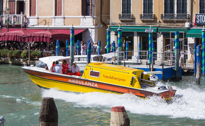 Современный Гранд-Канал остаётся важнейшей транспортной магистралью Венеции – здесь непрерывно курсируют вапоретто, гондолы, катера различных городских служб. Вот, к примеру, плывёт местная «скорая помощь».