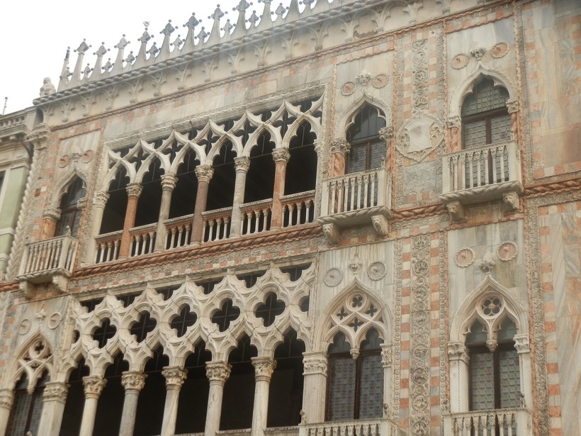 Фасад разделён на три яруса – традиционно для венецианских дворцов. Украшения в виде фамильных гербов и женских лиц над окнами тоже вполне привычны, а вот арки над окнами, напоминающие раздвижные мостики, выглядят необычно. И совсем уж бросаются в глаза два обелиска со львами на крыше – символизируют ли они что-то или добавлены просто для красоты, для меня осталось загадкой.