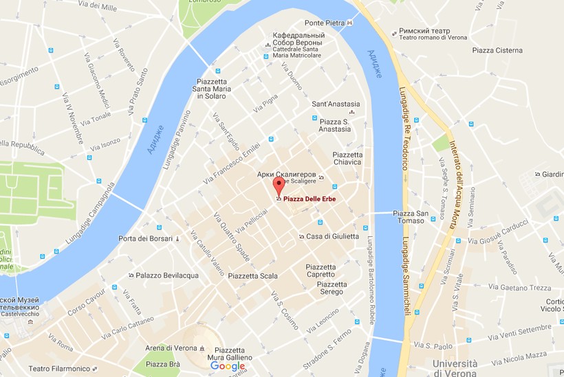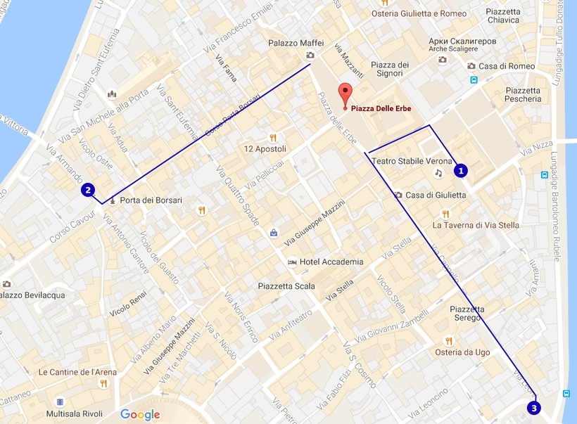 От Арены добраться до Пьяцца делле Эрбе удобно по улицам Via Anfiteatro и Via Stella или по узенькой Via Giuseppe Mazzini, все они выходят на Via Capello, прогулка до площади займет около 10 минут. Со стороны собора можно прогуляться по Via Duomo и Corso Sant’ Anastasia, через 8-10 минут вы придете на площадь со стороны Палаццо Мафеи.