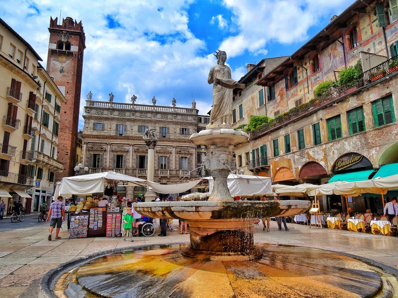 Свежие фрукты и ягоды, такие холодные и сладкие – первое, что вспоминается мне, когда я думаю о Пьяцца делле Эрбе (Piazza delle Erbe) в Вероне. Мне так приятно было сделать здесь небольшую остановку во время прогулки по городу: купить стаканчик с фруктами в одной из палаток, расположившихся в центре, присесть у фонтана и как следует осмотреть все строения на площади. Внимательно изучить здания на этой пьяцце – почти как учебник по архитектурным стилям прочесть. Здания в стиле барокко дополняются яркими фресками и готическими элементами.