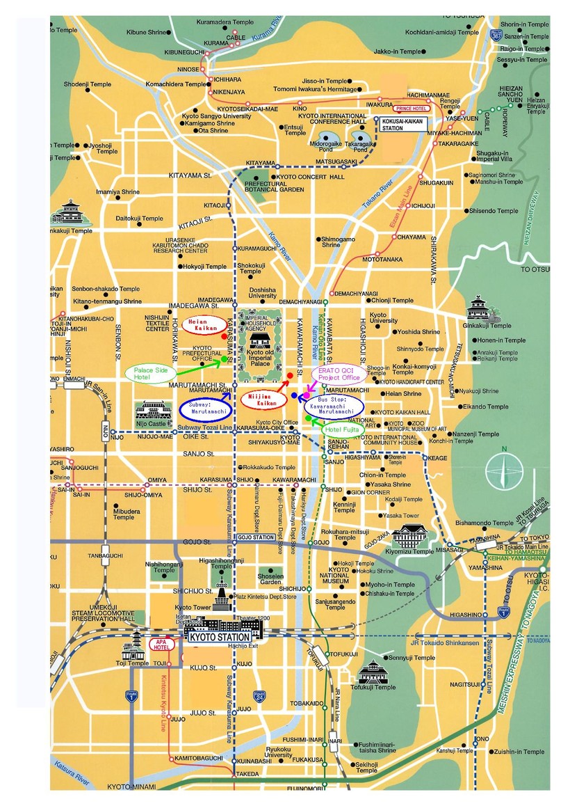 Через дорогу от северной конечной станции линий “Keihan “находится линия “Eidan Eizan”, которая идет в горы Хиэй и Курама. Линия “Hankyu” начинается в деловом центре города Shijo-Kawaramachi и сливается с линией “Karasuma” одной остановкой позже. Данную линию можно использовать для поездки в районы Арасияма и до императорской виллы Katsura Rikyu, а также до Осака и Кобе. Линии “JR” едут от вокзала Киото на северо-запад (линия “JR Sagano”), юго-запада (линия “JR Kyoto”) и юго-восток (линия “JR Nara”).