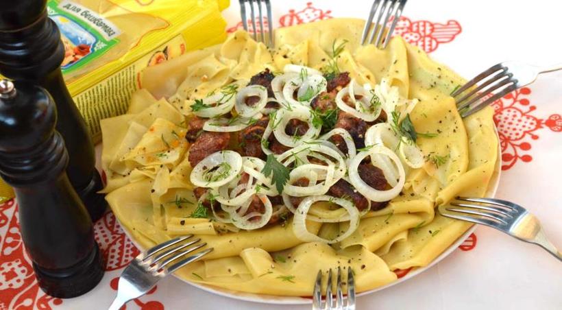 - Бешбармак – блюдо, приготовленное из мяса конины или баранины (можно заменить на любое другое) и тонких кусочков теста прямоугольной формы. Подается с мясным бульоном и луком, посыпанное петрушкой или кинзой на любые большие праздники, дни рождения, свадьбы. Бешбармак – одно из главных блюд казахского дастархана (= обеденного стола).