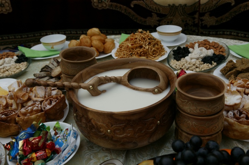 Традиционная казахская еда славится своей сытностью и большим количеством мяса: бешпармак, куырдак, казы, баурсаки. Также в Казахстане есть традиция пить чай с молоком или сливками. В такой чай могут добавить по желанию соль, масло, кусочки обжаренного курдючного сала или муку.