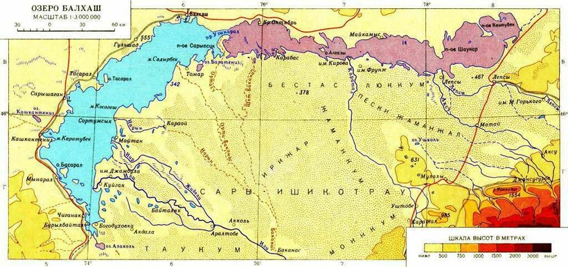 На карте озеро Балхаш (Казахстан) расположено в центре Средней Азии, в предгорьях Джунгарского Алатау. По административному делению Казахстана озерные берега занимают три области:
