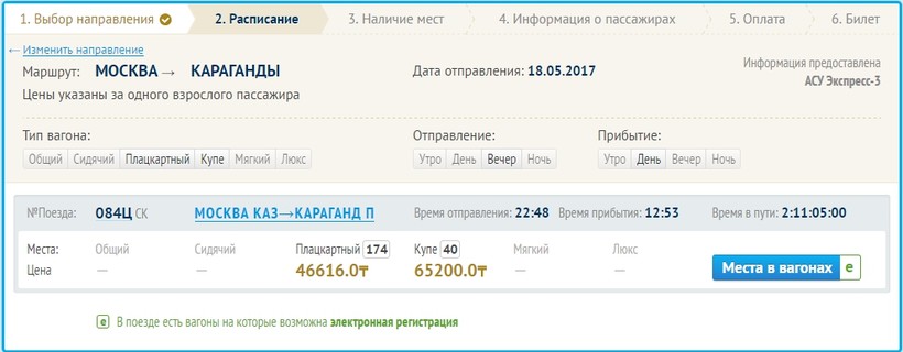 Из Москвы в Караганду и обратно через день ходит прямой поезд. В пути он находится двое с половиной суток — развлечение явно для искушенных. Сами поезда, честно говоря, местами дышат на ладан: вагоны относительно неплохие, но не для столь долгого путешествия. Кондиционеров, новомодных туалетов и прочих благ вы здесь днем с огнем не найдете. Да и стоит поездка равносильно полету, а то и дороже. Поэтому решайте сами. Цены на скриншоте актуальные (плацкарт — 8300 RUB, купе - 11700 RUB), от даты не зависят, билет онлайн можно приобрести здесь.
