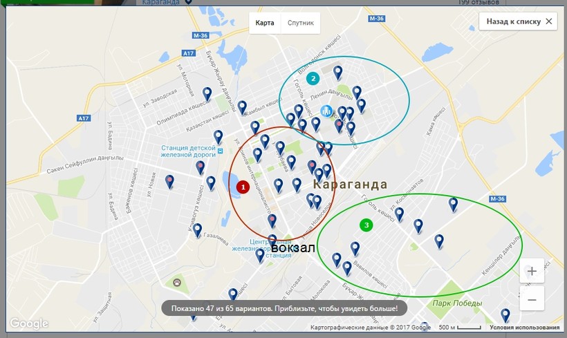 Остальные районы я даже обводить не стала. Услышите от арендодателя ключевое слово «Майкудук» — бегите куда подальше. Этот промышленный район — очень известный. И много чем. Без строгого присмотра каким-нибудь хорошим местным другом ездить строго не рекомендую. Разве что за острыми ощущениями. Хотя люди, которые там живут, зачастую считают, что место оклеветали, дескать «нормально спокойно живем». В общем, в центр вам дорога прямая.