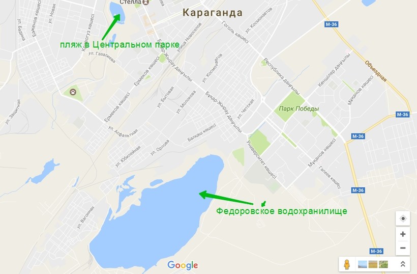 К сожалению, по воде до Караганды добраться не удастся — водоемы в городе представлены замкнутыми небольшими прудами и водохранилищами.
