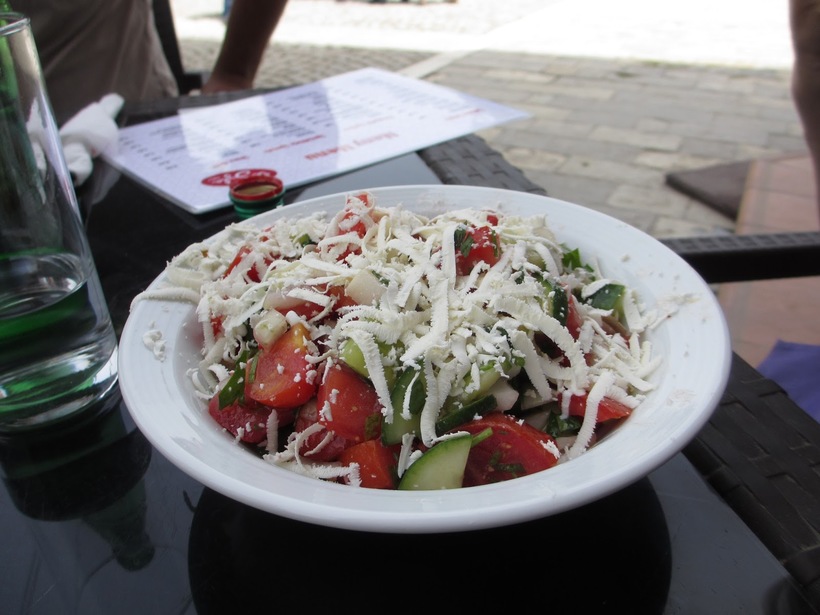 Любопытно: подаваемый в Сербии шопский салат из огурцов, помидоров, лука и сыра встречается и тут, иногда, правда, называется по-другому, но похоже. Что-то вроде «шопе».