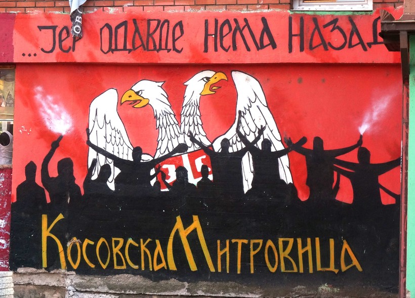 На мосту расположен пост миротворцев из Италии, они вооружены, и фотографировать их нельзя категорически. За нехитрыми баррикадами из мешков с песком начинается уже сербская земля: православный храм, крест на горе, знакомые супермаркеты, всюду говорят по-сербски, заведения балканской кухни... Отчаянными лозунгами здесь пестрит каждая стена, огромные граффити украшают центральную площадь.