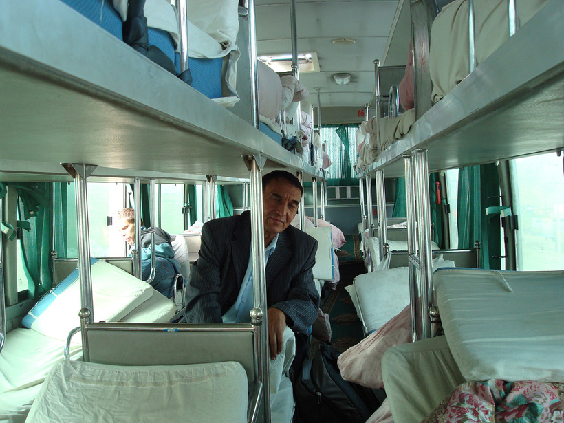 Я бы не рекомендовала такой способ хотя бы потому, что, если в поезде можно ожидать некоторый комфорт (туалет, горизонтальное положение), то в случае автобуса всё гораздо хуже, к тому же никто не застрахован от поломок, которые далеко не всегда случаются в населенном месте.