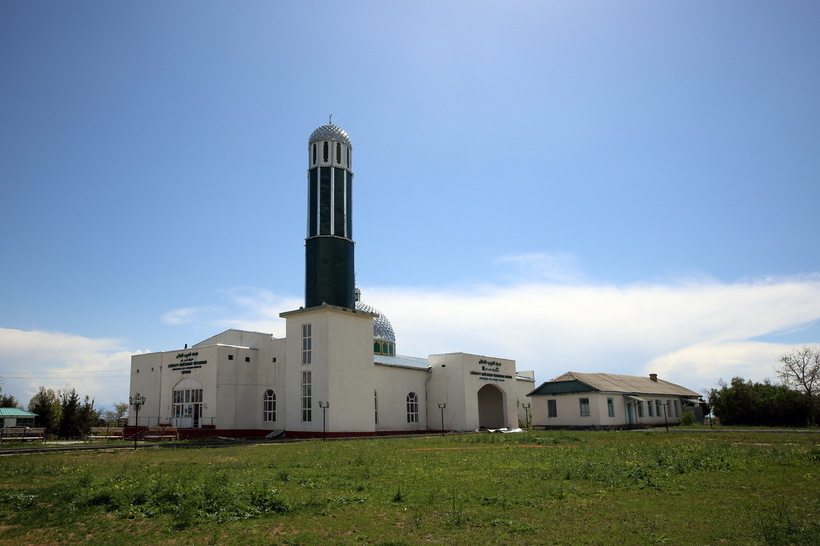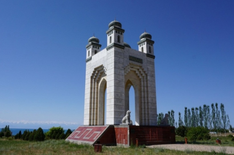 Мавзолей находится сразу на въезде в Чолпон-Ату. Эта постройка появилась здесь в 2009 годуф6 20-метровому строению специально был придан вид старинного мавзолея, но на самом деле тут нет никакого захоронения. Зато туристов, желающих запечатлеть его на фото, хоть отбавляй. Чтобы тоже сфотографироваться рядом, нам пришлось отстоять в небольшой очереди.