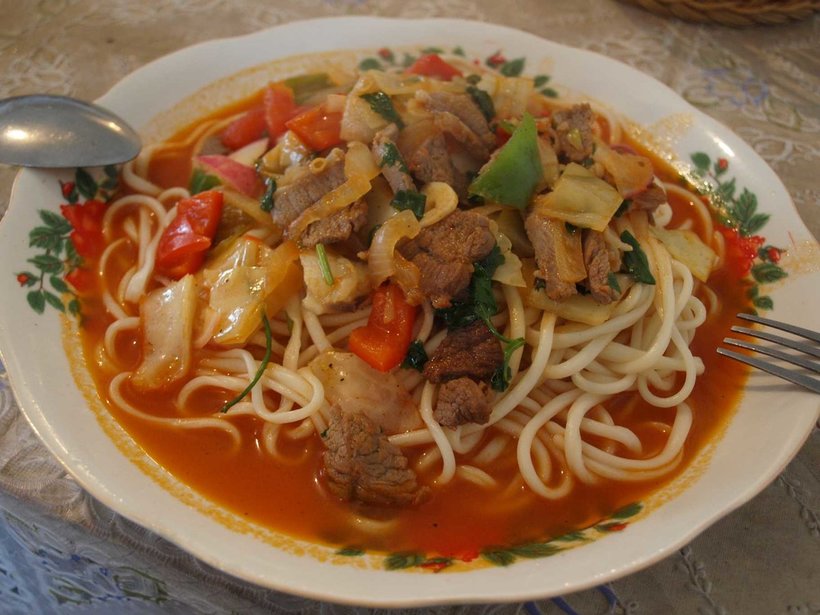 Лагман по-киргизски представляет собой густой суп из домашней лапши, больших кусков баранины и овощей. В некоторых местах добавляется еще и картошка. Очень сытное блюдо, подаётся в большой глубокой тарелке.