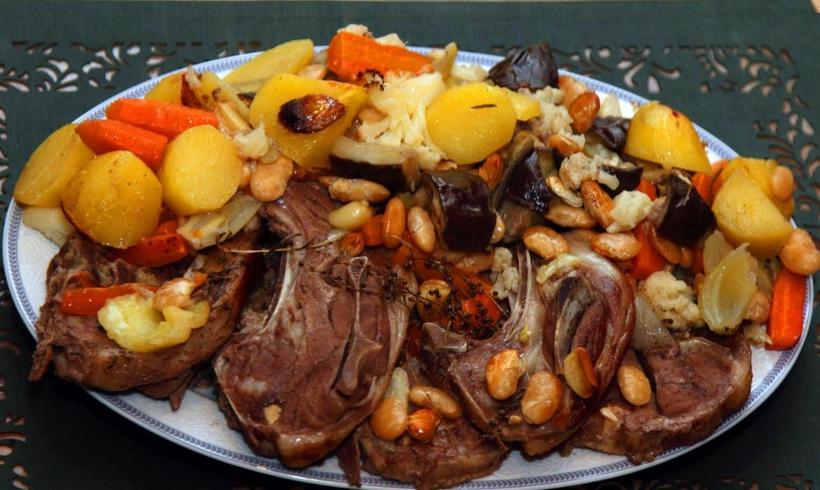 Баранина, нашпигованная курдючным салом. Мясо разрезается в нескольких местах, шпигуется маринованным салом, ароматными травами. Затем оно обжаривается в жире до румяной корочки и тушится до готовности в духовке. Подаётся с гарниром из жареных овощей – кабачков, патиссонов, баклажанов, помидор и бобов.