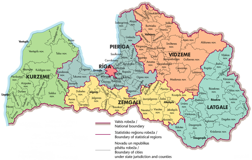 В Латвии официально четыре области: Видземе, Курземе, Земгале и Латгале плюс Рига и ее окрестности.