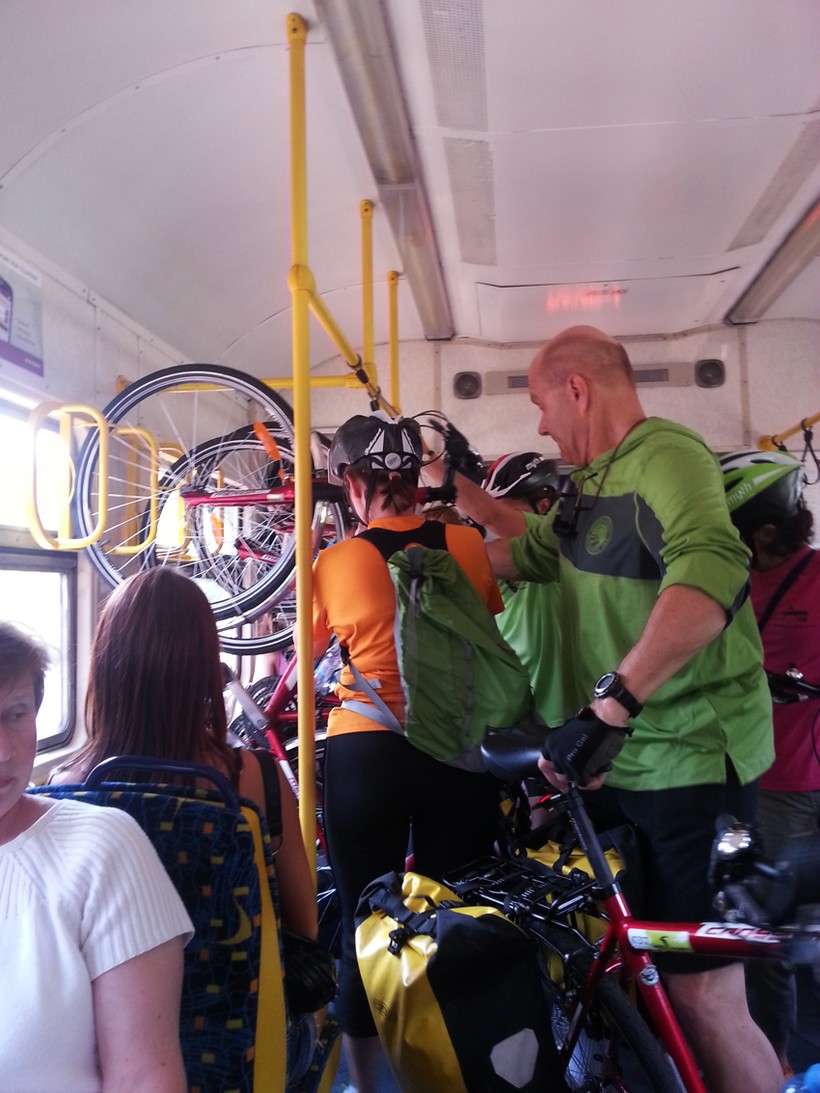В вагоне, кстати, предусмотрены компактные стойки для велосипедов, расположенные рядом со входом. Велосипедисты затаскивают свой двухколесный транспорт в вагон, в чем контроллер им обязательно помогает, и вертикально размещают в них свой транспорт.
