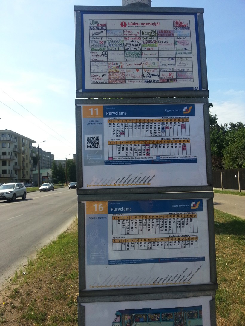А я, кажется, вижу табличку с расписанием транспорта. Возле каждой остановки обязательно стоят таблички с картой маршрутов и поминутным расписанием. Автобус ходит каждые 10-15 минут и приходит минута-в-минуту, с погрешностью максимум в две-три минуты. Я еду прямиком в центр Риги и мне подходит 22 автобус и 241 маршрутка. Вообще транспортная система очень налажена и ждать не приходится долго. Подробнее о транспорте я рассказывала в материале «Транспорт Риги».