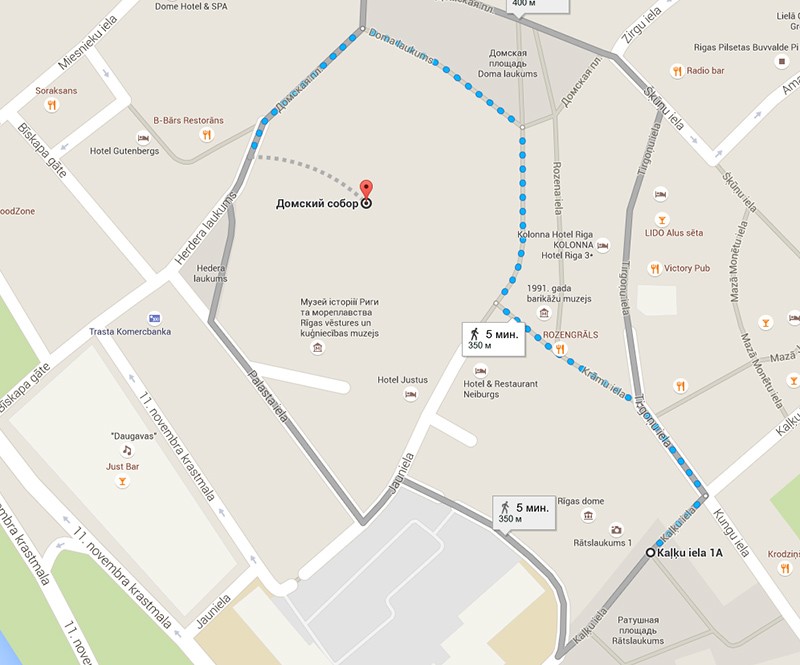 Дойти до Домского собора достаточно просто. На карте приведён маршрут от Ратушной площади, которую обязательно нужно посетить, находясь в Риге (да и не сделать это довольно сложно, учитывая размер исторического центра). Итак, от Ратушной площади нужно пройти по улице Тиргоню (Tigoņu iela), после чего по улице Краму (Krāmu iela) и всё, вы на Домской площади, в тени великолепного собора. Обойдя его по правой стороне и вдоволь налюбовавшись, вы придёте ко входу в храм.
