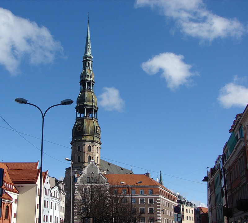 Следующая церковь, являющаяся визитной карточкой Риги, — это, разумеется, церковь Святого Петра. Впервые упомянутый в 1209 году, собор, как и большинство построек подобного масштаба, с годами менялся и рос. Из зала, состоящего из трёх нефов, он превратился в собор с великолепными барочными украшениями (особенно преобразился вход, украшенный в XVII).